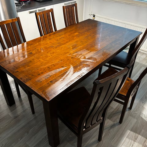 Pöydässä 50cm jatkopala eli saa 200cm pitkäksi. 5 tuolia kuuluu pakettiin. Kuudes tuoli vaatii remonttia.