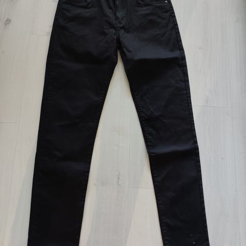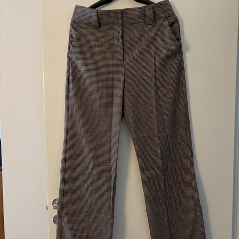 Hyväkuntoiset housut polyesteriä-puuvillaa. Taskut, pienet halkiot. Vyötärö tasona 46 cm, vyötärö-haara 26 cm, haara-lahje 72 cm.