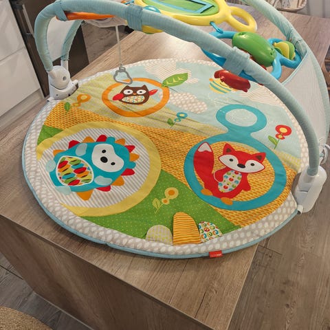 Lasten leikkimatto, takapuoli on kuminen. Kuvassa näkyy kolme kohtaa, joissa lanka on tullut läpi. Muuten on kunnossa. Käytön jälkiä löytyy. Kissatalous.