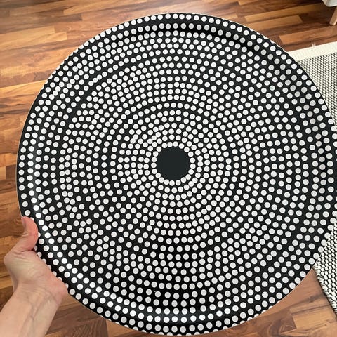 Marimekko Fokus Tarjotin on halkaisijaltaan 46 cm kokoinen, siinä on mustavalkoinen fokus kuviointi. Tarjotin on valmistettu kestävästä materiaalista ja soveltuu erilaisiin tarjoilutilanteisiin.
