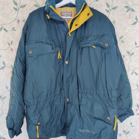 Hyväkuntoinen tummanruskea tikkitakki irrotettavalla karvakauluksella. Koko X/XL.