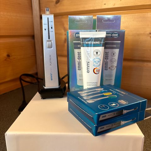 Mukana alkuperäinen paketti ja osat: käyttöohje, latausteline/laturi, hammasharjan varsi/käsiosa, kaksi eri kokoista harjauspäätä suojineen (pienempää käytetty vähän, isompi käyttämätön) sekä avattu ja vähän käytetty ultraäänihammastahna.