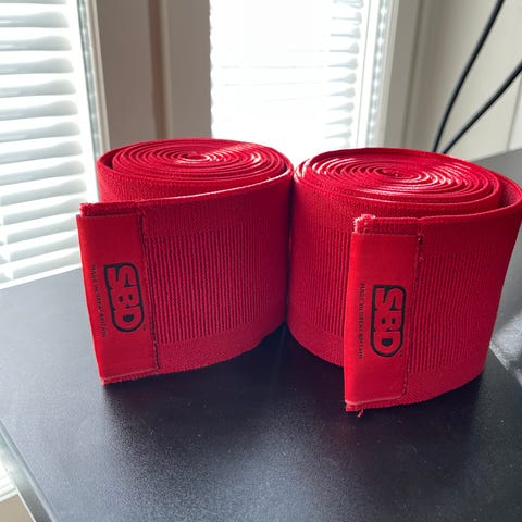 SBD polvisuojat, joissa musta ja punainen väri. Suojat on suunniteltu tarjoamaan tukea ja suojaa polville harjoittelun aikana.