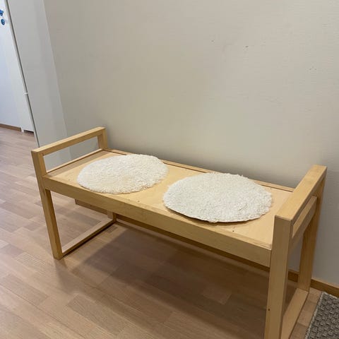 Vanha penkki, jossa juuri uusittu beige verhoilu. Istuinosa verhoiltu kestävästä kankaasta. Penkin jalat ja runko valmistettu puusta.