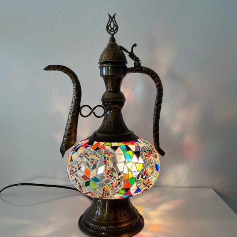 Hyväkuntoinen, jalka antiikkimessinkiä, kupu valkoista lasia. Korkeus 45 cm.