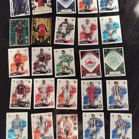 Pääsääntöisesti ok-hyväkuntoisia Topps jalkapallokortteja eri vuosilta, osassa jälkiä kulmissa kun kulkeneet lapsen mukana.