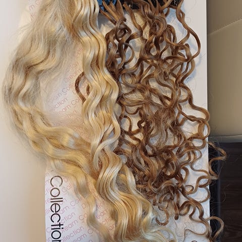 Sinetti pidennykset 112 kpl , aito tukka. Noin 54cm , latvoja leikattu ollut 60cm. Alkuperäinen väri ruskea itse värjätty mustaksi ja muutama punainen seassa.