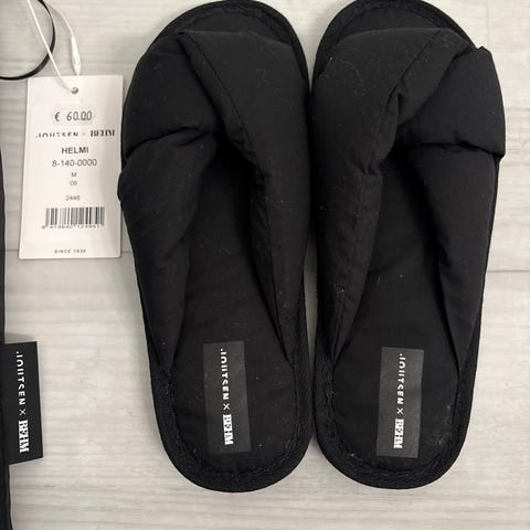 Käyttämättömät mustat tossut Joutsen × Behm -mallistosta. Koko M ja on ainakin omaan koon 38 jalkaan sopivan napakat.