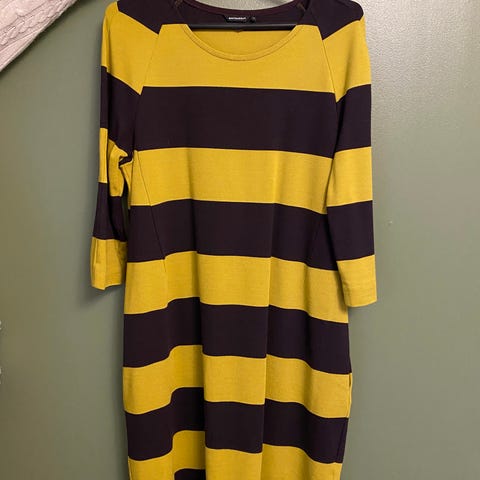 Kuvanmukainen mustavalkoinen mekko. Koko M. Napakkaa, paksumpaa materiaalia. Joustaa. Takana pitkä vetoketju. Kirkkaat värit. Pituus olalta 114 cm, kainalomitta 48 cm.