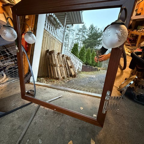 Myydään peili ja valaisin. Peilissä on käytön jälkiä ja kulumaa. Peilin alareunassa särö ja alareunasta peiliä kulunut, muuten hyvässä kunnossa. Valaisin hyvässä kunnossa. Peilin leveys 120 cm ja korkeus 115 cm.