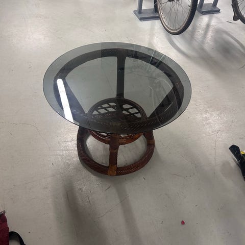 pyöreä lasipöytä, jossa on lasikansi ja valkoinen runko. Pöytä soveltuu olohuoneen kalusteeksi ja tarjoaa modernin designin yhdistettynä käytännöllisyyteen.