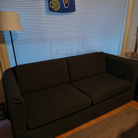 Sohvat 2 ja 3-istuttavat vaaleat, vahvaa kangasta. Puurunkoiset ja ehjät mutta jonkin verran likaantuneet, tarvitsee pesun.