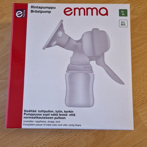 Emma käsikäyttöinen rintapumppu valkoisella värillä. Mukana pullon, tutin ja korkin pumppuosaa suojaavaksi. Soveltuu rintamaidon pumppaamiseen manuaalisesti.