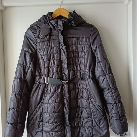 Äitiystalvitakki koko S. Hupussa irrotettava karvareunus. Toinen taskunsuu vähän revennyt (ks. kuva), muuten ihan hyväkuntoinen.
