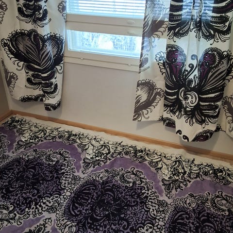 Vallila, Tulisielu, Verhot ja matto mustavalkoisella ja violetilla kuviolla,