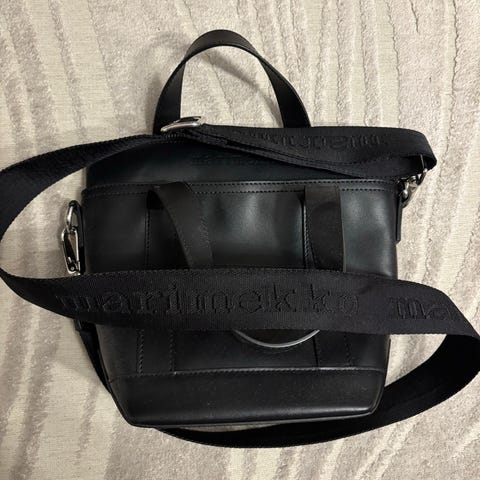 Marimekko nahkainen naisten laukku. Laukku on valmistettu nahkasta ja siinä on kantokahvat sekä säädettävä olkahihna. Laukussa on vetoketjullinen päällinen ja ulkopuolella tasku. Väri on ruskea. Kunto uutta vastaava. En huomannut mitään kulumaa tms