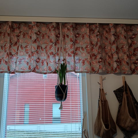 Vallilan verhokappa, jossa on vaalealla pohjalla vaaleanpunaisia kukkakuvioita ja harmaita oksia. Ehjä, puhdas, siisti. Vain nouto.