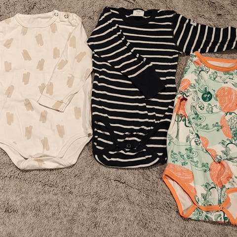 Kolme bodyä yhteishintaan 3€. Nalle-body Newbie 80-86 lyhyt ja hieman leveämpi malli joka sisältää valkoisen bodyn ja siinä kiinni tuo nallepaita, delfiinit valokuvabidy pop&co 74-80 ja delfiinit piirosbody Blaa 74-80.