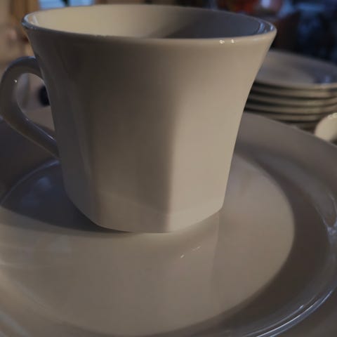 Kuljetuksessa mennyt yksi kuppi rikki ja yhdessä lautasessa lovi (näkyy kuvassa).