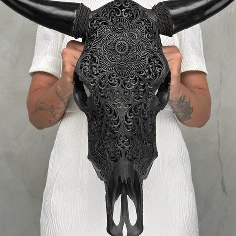 Suuri käsin kaiverrettu härän pää, jonka ovat kaivertaneet taiteilijat, jotka ovat siirtäneet muinaisen kaiverrustaidon isältä pojalle.Kallo on kokonaan käsin veistetty suurella huolella. Se on epätavallinen, koristeellinen kappale.Kaiverrettu on kaunis tähtimandala-motiivi.Noin mitatPituus: 55 cmLeveys: 51 cmHUOM:Olemme lisänneet kuvia käsityöläisistämme työssään antaaksemme kuvan siitä, millainen prosessi on kaiverratetun pään luominen.Ole hyvä ja huomaa, että nämä kuvat on otettu hämärässä studiosta, ja värit voivat vaihdella ympäristön mukaan.Teline ei sisälly.Paino, joka mainitaan, sisältää pakkausmateriaalin.VastuunvapausPäähän on kiinnitetty kiristysnarusta, jotta se voidaan kiinnittää seinälle.Sarvet irrotetaan kuljetuksen ajaksi, ja ne on helppo kiinnittää uudelleen. Sarvet ovat aina pakkauksen pohjalla, kallon alla. Varmistathan, että poistat sarvet ennen pakkauksen hävittämistä.- Koska kyseessä on luonnollinen kallo, siinä saattaa olla joitakin luonnollisia pieniä halkeamia, uurteita tai puuttuvia hampaita. Tämä on normaalia. Katso kuvat viitteeksi.- Kallomme puhdistetaan ammattilaisvoimin, mutta joskus hampaissa voi esiintyä pieniä värimuutoksia. Tämä on luonnollista ja normaalia, eikä siihen voida paljoa vaikuttaa. Katso kuvat ohjeiden tueksi.LähetysKohde lähetetään seurantanumerolla DHL Parcelin, DPD:n tai postNlin kautta. Seuranta päivittyy Catawiki-luettelossasi, kun pakettisi on jätetty postiin.Ole hyvä ja tarkista säännöllisesti välttääksesi pakettisi palautumisen meille, jolloin ostaja vastaa toisen lähetyksen toimituskuluista.Seurantaan Espanjaan ja Portugaliin käytä tätä linkkiä ja lisää Catawiki-erästäsi saatu seurantanumero.https://clientesparcel.dhl.es/LiveTracking/HomeEMME YHDISTÄ TOIMITUKSIA!!!- Jos sinulla on kysyttävää paketistasi, ota yhteyttä meihin Catawiki-viestipalvelun kautta. Yritämme vastata kolmen työpäivän kuluessa.