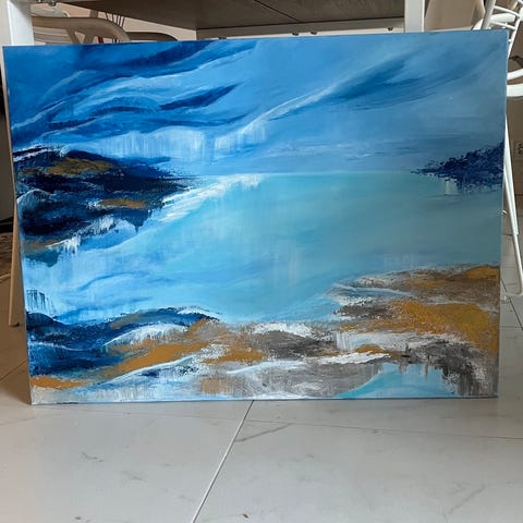 Abstrakti maalaus, jossa on ruskean, harmaan ja keltaisen sävyjä. 70x90cm canvakselle