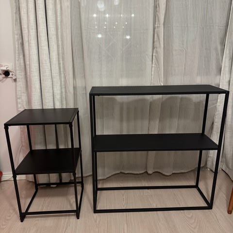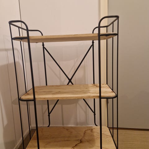A small shelf bought from Clas Ohlsson (39,95€). Black, metallic. Has some small scratches on the top shelf, but only visible in some lights.