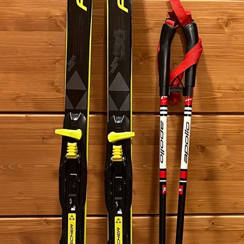 Fischer sukset kätevillä siteillä. Saa auki vaikka rukkaset kädessä. Monot kokoa 28 ja sauvat saa myös mukaan.