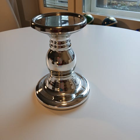 IKEA metallinen kynttilänjalka, hopeanvärinen. Sopii koriste- ja käyttöesineeksi kynttilöiden tukemiseen.