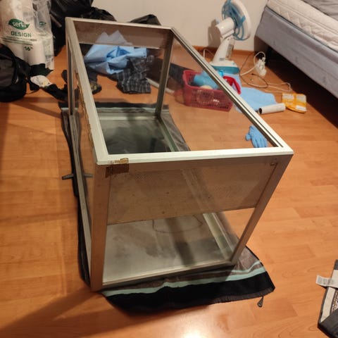 Muutossa terraarion pohja halkesi! Ei pidä siis enää vettä, mutta lasin kun naputtelee pois voi laittaa puun tms siihen tai korjauttaa uusi lasi/pleksi.