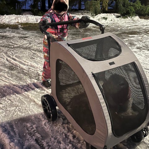 Hyvät ja vakaat koiranrattaat. Mukana tulee sadesuoja, joka suojaa voimakkaalta sateelta ja lumelta. Rattaiden sisällä on myös kaksi kiinnityspistettä kahdelle kaulapannalle.