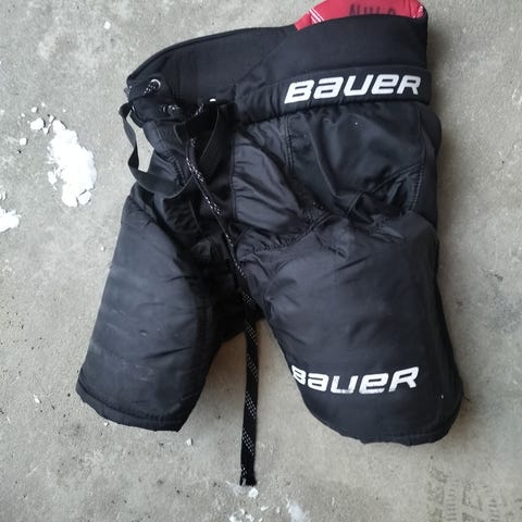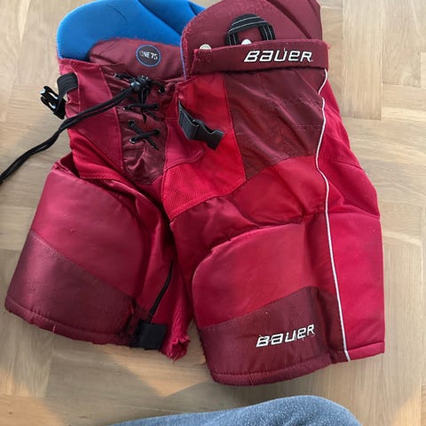 Bauer Jääkiekkohousut koossa Jr S. Vähän kuluneet jo mutta menee pelailuissa tai esim luistelun harjoittelussa suojana.
