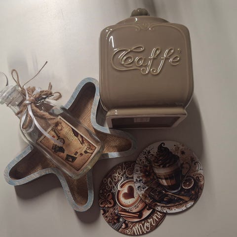 Sisustuspaketti sis. Tyynyn, 2kpl lasinalusia, pieni purkki ja pullo.