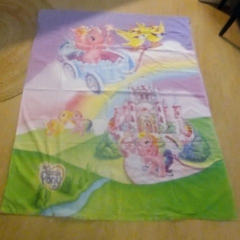 MLP pussilakana ja tyynyliina. Yhdellä puolella kuva kolmesya ponista ja teksti. Toisella vaaleanpunaisella taustalla poni kuviota. Tyynyliina molemmilta puolilta sama.