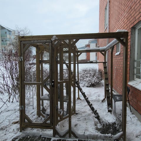 Puinen elementeistä rakennettu kissan ulkohäkki, jossa on metalliverkko. Häkki on suunniteltu ulkokäyttöön. Häkissä on tukevilla saranoilla varustettu, vahvalla metallisalvalla sekä hakasella suljettava ovi. Katto on laskeva, jotta lumi, vesi ja roskat valuvat sieltä pois. Kissoille on lisätty kiipeilypaikkoja seinille. Koko S 154cm x L 299,5cm x K 238-250cm. Itse purkaen 75€, valmiiksi purettuna 100€.