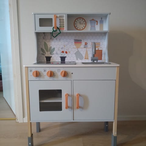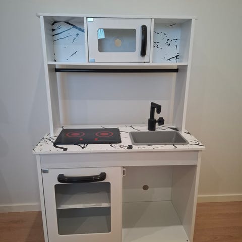 Myydään siisti ja ehjä leikkikeittiö. Väreinä musta ja harmaa. Kultainen hana, pöytätaso vaalea.