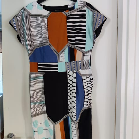 Marimekko Kimpi / 39862 mekko. Valmistettu puuvillasta, vuori 50% polyesteri ja 50% viskoosi. Sivussa vetoketju ja takana halkio.