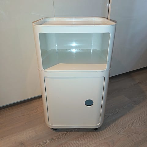 Design sivupöytä. Tv tasona käytössä ollut. Pintamateriaali herkästi naarmuuntuvaa ja myös tässä tietyssä valossa naarmut nähtävissä mikä ei haittaa käyttöä eikä silmiinpistävästi näy. Ehjä ja siisti. Varsinkin pienessä tilassa hienosti luo ilmavaa ja tilavaa tunnelmaa tyylikkäästi.