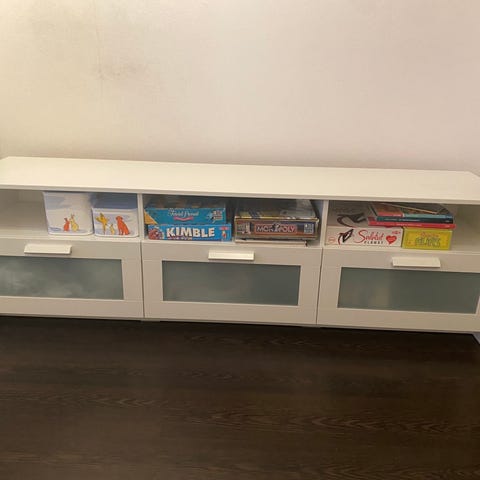 Hyvä kuntoinen valkoinen Ikean Brimnes tv taso muuton alta pois. Vain yksi pieni kolhu joka näkyy kuvassa. Vain nouto!