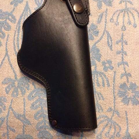 nahkainen aseen tupenpidike musta väri. Valmistettu nahasta, tarkoitettu aseen kantamiseen ja säilytykseen.