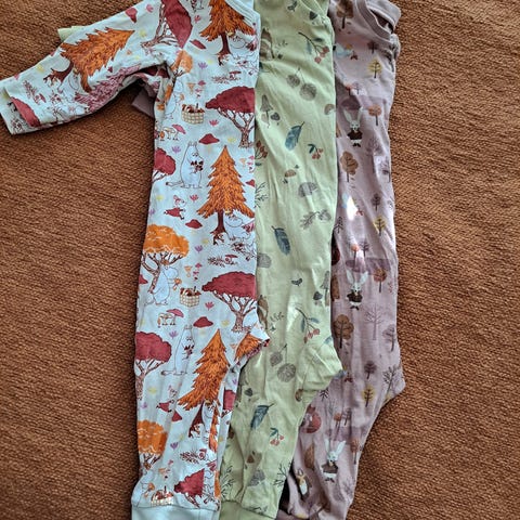 Kolme yöpukua / pyjamaa koko 68. Kaikissa tuplavetoketju. Kuosit sopivat myös unisex käyttöön.