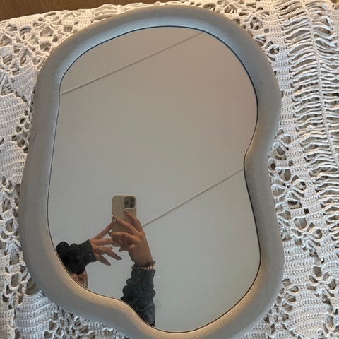 Valkoinen peili. Hyvässä kunnossa. Peili osa suojattu, mutta siinä ei käytön jälkiä. Kaipaa pientä puhdistusta kellarin jäljiltä.