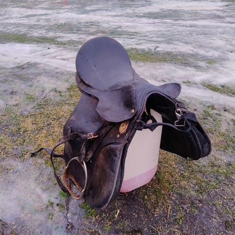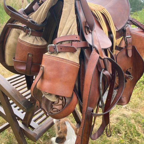 Myyntiin hyllystä pölyttymässä vanha armeijan (?) satula. Koristeeksi tai leikkeihin.