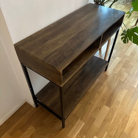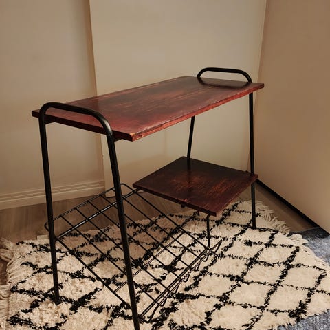 Hopeanharmaaksi maalattu seinään nojaava hylly. Pinnassa sanomista joka näkyy kuvissa. Nojaa ihan itsenäisesti seinää vasten, voi asentaa kulmaraudat jos haluaa. Tampereen keskustan läheisyyteen toimitus pientä korvausta vastaan onnistuu.