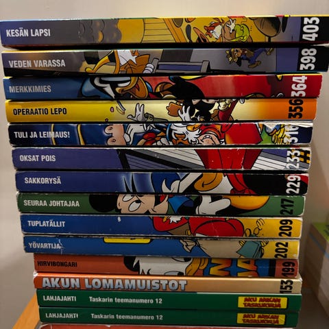 Hyväkuntoisia Aku Ankan taskukirjoja.
