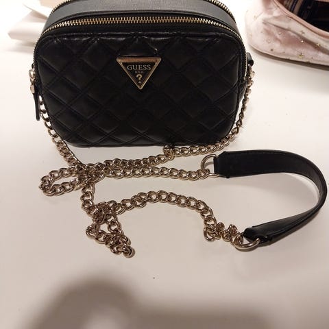 Guess naisten olkalaukku, valmistettu mustasta tekonahasta. Laukussa on musta värinen ketjuhihna ja vetoketjusuljenta. Pieni ja käytännöllinen malli arkeen tai juhlaan.