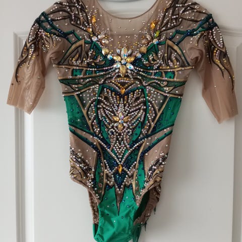 Lasten tanssipuku koko 146. Puvussa on värikäs kuviointi sinisen, keltaisen ja oranssin sävyissä. Materiaalina joustava kangas, jossa koristeena strasseja. Soveltuu tanssiharjoitteluun ja esiintymisiin.