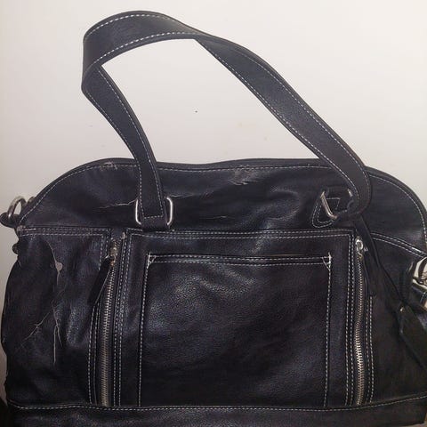 Tekonahkainen isohko käsilaukku, jossa irroitettava olkahihna. Etupuolella strassikoristelua. Sisäpuolella vetoketjullinen iso sisätasku sekä pieni vetoketjullinen tasku ja 2 pientä avotaskua. Laukun reunoissa ja pohjassa paikoittain minimaalista kulumaa.