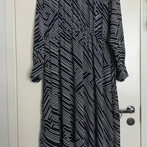 Kerran käytetty, erittäin siisti mekko, hyvinlaskeutuvaa materiaalia. Leveys kainalosta kainaloon 61cm, pituus olkapäältä helmaan 94cm.