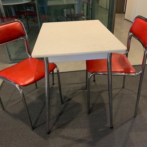 Myydään näyttävä ja erittäin laadukas vintage design-ruokapöytä 1980-luvulta sekä alkuperäiset Session Imatra Finland -tuolit.