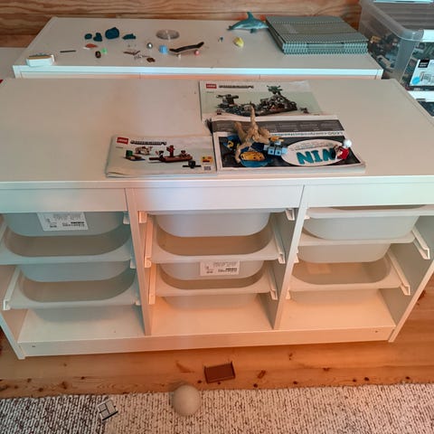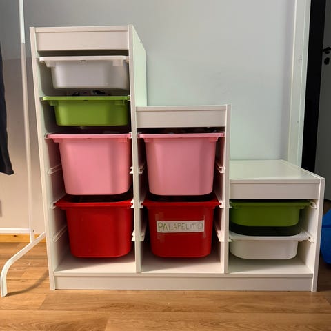 IKEA lastenhuoneen Trofast säilytyskaluste, hieman kärsinyt kovassa käytössä mutta edelleen laatikot liukuu hyvin pois ja paikoilleen. Yhteen laatikkoon lapsi kirjoittanut tussilla, enkä ole jaksanut koittaa putsata pois. Kuvassa näkyvät rojut ei kuulu kauppaan.